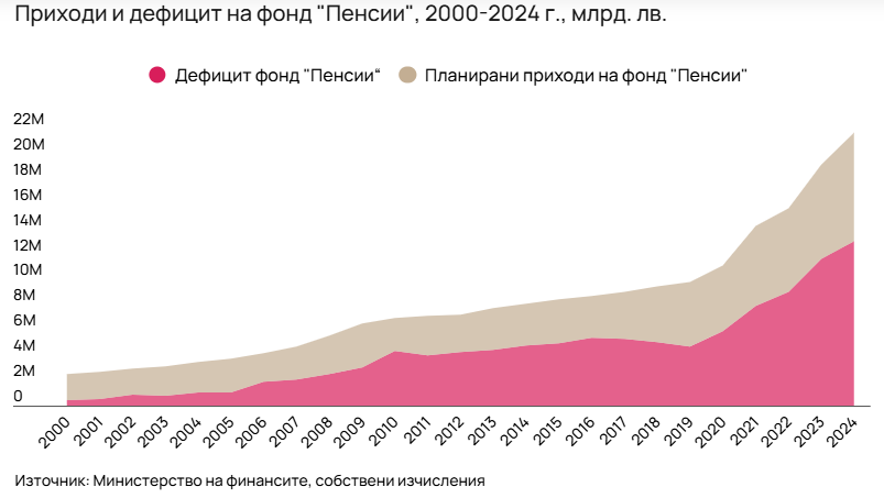 През последните 25 години дефицитът на пенсионния фонд е нараснал над 20 пъти – от 400 млн. лева до 13 млрд. лева, сочи анализ на Института за пазарна икономика (ИПИ). Заради инфлацията и икономическия растеж през това време обаче по-показателен е делът на недостига в общите разходи на фонд „Пенсии“. В началото на хилядолетието има много сериозно разрастване – от под 20% през 2000 – 2001 г. до 61% през 2010 г. – отчасти заради рязкото влошаване на пазара на труд след финансовата криза, отчасти заради демографските тенденции. Следващото си най-ниско равнище дефицитът достига през 2019 г. – 48%, в резултат на постепенното изсветляване на икономиката и високата заетост. През 2023 – 2024 г. обаче той отново надхвърля 60% – равнища, характерни за кризисни години, въпреки наглед нормалното състояние на националната икономика и изключително високите нива на заетост.